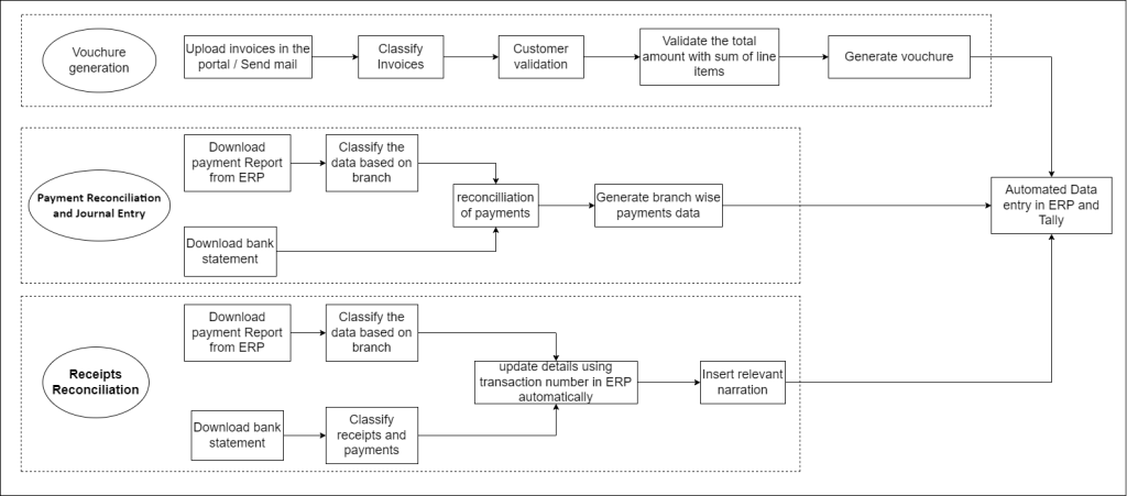 Automation:Automate the entire process, including report downloads, data extraction, invoice classification by branch and godown, CSV file generation in Tally-compatible format, and automated Tally ERP entry for each branch using RPA bots.